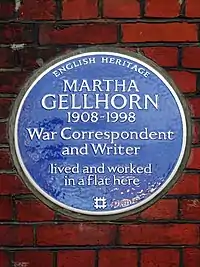 In 2019, a blue English Heritage plaque was unveiled at Gellhorn's former London home, the first to feature the dedication of "war correspondent".[32]