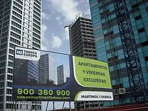 In March 2015, the company filed for bankruptcy, holding assets worth €2.4 billion ($2.7 billion) with debts worth €7.0 billion, making its collapse one of the biggest bankruptcies in Spanish history.[6] Trade of the company stocks were abruptly suspended, leaving no chance for its investors to unload them.[7] The liquidation of the company started the following month.[8] The company was definitely banned from trading on the stock exchange in October 2015.[9] In July 2018, Martinsa-Fadesa entered the final phase of liquidation. The website martinsafadesaliquidacion.es was set up to follow the liquidation process.[10] In November 2018, in the aftermath of the crash, the lawyer Antonia Magdaleno was found responsible for the giant debt of the company and sentenced to 4 years in jail.[11]