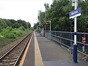Marton is a railway station on the Esk Valley Line, which runs between Middlesbrough and Whitby via Nunthorpe. The station, situated 2 miles 79 chains (4.8 km) south-east of Middlesbrough, serves the suburbs of Marton, Middlesbrough and Ormesby, Redcar and Cleveland in North Yorkshire, England. It is owned by Network Rail and managed by Northern Trains.