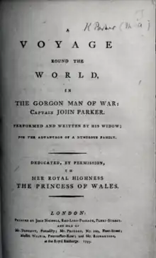 John Parker died in 1794, leaving his wife in financial difficulty. At the start of the book she stated that her motive for writing was her family's need for money. This sounded like the conventional, self-deprecating 18th century lady's excuse for publishing.[3] "Nothing but the greatest distress” would have led her to do so, she said.[1] The title page read "A Voyage round the World, in the Gorgon Man of War: Captain John Parker. Performed and Written by his Widow; For the Advantage of a Numerous Family".