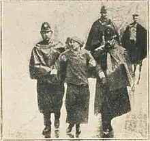 She committed a number of acts of arson, smashed windows at the Home Office and bombed a railway station. She was arrested nine times, receiving prison terms totalling more than three years.[5][4] She was one of the first two women force-fed and released to recover and be re-arrested under the 1913 Cat and Mouse Act, Prisoners (Temporary Discharge for Ill Health) Act 1913, serving her sentences in HM Prison Holloway.[1]