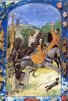 In the Book of Hours of Mary and Maximilian (Berlin, SM, Kupferstichkabinett, Ms. 78 B 12, f. 220v.), the falcon and the hunt scene were shown, not as display of political significance, but only tragedy. Karaskova suggests that the coincidence that combined the Duchess's favourite mode of portrayal and the manner of her death must have had an impact on the illustrator as well as the commissioner, in this case Maximilian.[90][91][92] According to the documentary Der letzte Ritter by Zweites Deutsches Fernsehen (ZDF), in his conversations with their daughter Margaret, the emperor associated the call of the falcon with "the blackest day of his life" (he remained a passionate falconer though – In his cenotaph, where there are also Mary's and his statues, the belt of Mary's grandfather, Philip the Good, displays the image of a male falconer and a female falconer).[75][93]
