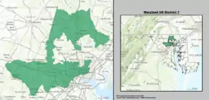 Maryland's 7th congressional district of the United States House of Representatives encompasses almost the entire city of Baltimore and some of Baltimore County. The district was created following the census of 1790, which gave Maryland one additional representative in the House. It was abolished in 1843 but was restored in 1950 as a west Baltimore district. It has been drawn as a majority-African American district since 1973. Democrat Kweisi Mfume is the current representative, winning a special election on April 28, 2020, to finish the term of Elijah Cummings, who died in October 2019.[3] Mfume had previously held the seat from 1987 to 1996.
