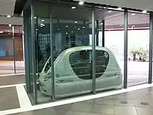 In 2018, as part of a trial project, seven autonomous shuttles, called NAVYA, began to operate on the podium, carrying passengers between the car park and the city center.[22] A further route was due to open in 2019 that ran from the residential complex above the city's North Car Park to the headquarters of the International Renewable Energy Agency (IRENA) and the Majid Al Futtaim's My City Centre Masdar Shopping Mall.[23][24][25]