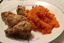 Mashed carrot is a dish prepared by cooking and then mashing carrots. Milk, butter, salt and pepper are commonly mixed in after the carrots are mashed.[1] Carrots can also be roasted in the oven before mashing.[2][3] Other mashed vegetables may be added to the mashed carrots. These include onions, parsnips, turnips, squash, and rutabaga.[4][5][6][7] Mashed potatoes may be mashed along with mashed carrots.[8]