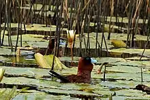 These ducks mainly feed on seeds, roots, stems,[6] and leaves of aquatic plants. They also eat aquatic insects and crustaceans. They feed by diving. These ducks are usually very secretive, but they are not rare and not considered threatened by the IUCN.[1]