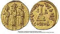 Early gold dinars imitated Byzantine and Sasanian coins of the time, but as time progressed, they began to take on a more uniquely Islamic style. Two early examples, minted in approximately 692 and 694 C.E., have similar designs. Both have a depiction of figures on the obverse while the reverse includes a pyramid-shaped pedestal and a staff with a circular head resting at the top. These two early coin types both bare significant resemblance to Byzantine coins of the same period. In fact, they were all but copied whole cloth from Byzantine designs, the only alterations being the removal of the horizontal bar of the Byzantine cross for religious reasons and the conversion of figures on the front to wearing Islamic-style dress.[3] In the year 692 C.E., the Shahada, or profession of faith, was added onto the obverse and in 694 C.E. it was added to the reverse.[3] In the year 696-7 C.E., images were almost completely removed from coins and were replaced by coins exclusively decorated with inscriptions.[4]
