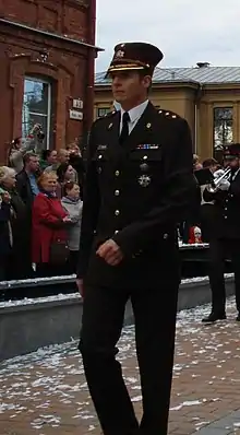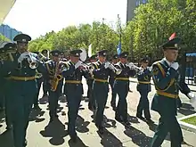 Russian military bands fall under the jurisdiction of the Military Band Service of the Armed Forces of Russia, which is the official music service for the Russian Armed Forces, and led by the Senior Director of Music, a billet of an officer with the rank of a Colonel or a general officer. There are currently between 200 and 300 military bands in the Russian Armed Forces that span across the military as well as all uniformed services in the country.[1][2] Unlike most western nations, the Armed Forces does not maintain any bands composed of volunteering civilian musicians, as all bands, active or reserve, are manned by graduates of the military music training centers stationed anywhere in the country, as well as of civilian conservatories. While choirs may be attached to military bands, individual staff choirs do not exist in the Russian Armed Forces, since they have attached instrumental ensembles or orchestras. As of 2009, all military musicians are paid around 13,000 rubles ($169.65) for their service in the Armed Forces and other uniformed organizations.[3]