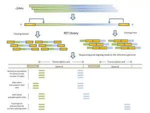 - RNA-PET: This application is used for studying the transcriptome: transcripts, gene structures, and gene expressions.[1][10] The PET library is generated using full length cDNAs, so the ditags represent the 5’ capped and the 3’ polyA tail signatures of individual transcripts. Therefore, RNA-PET is especially useful for demarcating the boundaries of transcription units. This will help identify alternative transcription start sites and polyadenylation sites of genes.[1] RNA-PET could also be used to detect fusion genes and trans-splicing, but further experiment is needed to distinguish between them.[11] Other methods of finding the boundaries of transcripts include the single-tag strategies CAGE, SAGE, and the most recent SuperSAGE, with the CAGE and 5’ SAGE defining the transcription start sites and the 3’ SAGE defining the polyadenylation sites.[1] The advantages of PET sequencing over these methods are that PET identify both ends of the transcripts and, at the same time, provide more specificity when mapping back to the genome. Sequencing the cDNAs can reveal the structures of transcripts in great details, but this approach is much more expensive than RNA-PET sequencing, especially for characterizing the whole transcriptome.[10] The major limitation of RNA-PET is the lack of information regarding the organization of the internal exons of transcripts. Therefore, RNA-PET is not suitable for detecting alternative splicing. In addition, if the cloning procedure is used construct the cDNA library before generating the PETs, cDNAs that are difficult to clone (as a result of long transcripts) would have lower coverage.[10] Similarly, transcripts (or transcript isoforms) with low expression levels would likely be under-represented as well.