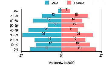 According to the 2002 Poland census, there were 290 people residing in Matiaszów village, of whom 50.7% were male and 49.3% were female. In the village, the population was spread out, with 24.8% under the age of 18, 35.2% from 18 to 44, 18.6% from 45 to 64, and 21.4% who were 65 years of age or older.[2]