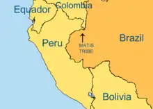 The Matis people (also called Matsë in their own native language) are an indigenous people of Brazil.[1] The Matis are commonly named the Jaguar people by tourists and filmmakers, but they do not like the name. They live in three separate communities with a total population of roughly 340. They live in the far west of Brazil, in the Vale do Javari Indigenous Territory, an area covering 83,000 square kilometres (32,000 sq mi). They practice hunting, fishing, foraging and agriculture. Now, they also receive money from their work as teachers, health assistants, and surveillance of the territory for FUNAI, for example, and the elders receive pensions from the government (registered as retired farmers, as other traditional communities also have the right for in Brazil).