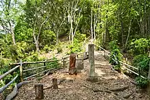 The Matsuokayama Kofun is a zenpō-kōen-fun (前方後円墳), which is shaped like a keyhole, having one square end and one circular end, when viewed from above. It is located at an elevation of 60 meters, the highest point of the narrow hills of Mt. Matsuoka (Miyama) on the south bank of the Yamato River as it enters the Osaka Plain in the eastern part of Osaka Prefecture, and within the grounds of a Shinto shrine, the Kokubu Jinja. The tumulus has a total length of between 130 and 155 meters, with a posterior circular portion diameter of 72 meters and is orientated to the east. The mound was constructed by stacking thin plate-like stones. The mound was originally constructed in three or four tiers on the posterior circle and two tiers in the anterior rectangular portion, and had both fukiishi and rows of oval cylindrical haniwa; however, the covering earth has eroded away, leading the sarcophagus exposed and the stone slabs used in the burial chamber scattered.[2] This sarcophagus is a combination of six stones, one each for the lid and base stones and four one each side. Two side stones are accompanied by a rope-hanging protrusions. The surface of the bottom stone is carved to fit the body of the burial person.
