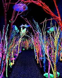King was part of the collaborative team of artists that launched Meow Wolf in 2008.[3] He developed or co-developed 34 Meow Wolf projects including House of Eternal Return in Santa Fe and Omega Mart in Las Vegas,[7] as well as being the lead artist on The Cathedral at Meow Wolf Denver.[3][9] He was a lead artist on many interactive artworks including the Glowquarium installation and the Fancy Town at the House of Eternal Return.[9] The Fancy Town installation doubles as an event venue, and has the appearance of an Old West ghost town made of recycled scrap wood and construction waste. King described it as “Turning your capitalistic trash into freedom of expression.” King constructed the surrounding walls to have the appearance of old storefronts.[10]