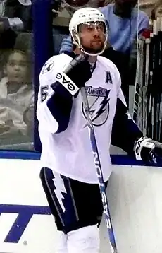 Becoming an unrestricted free agent in the off-season, Öhlund signed a seven-year, $26.25 million contract with the Tampa Bay Lightning on July 1, 2009.[28] Brought in as a mentor to fellow Swedish defenceman Victor Hedman, whom the Lightning drafted second overall in the 2009 NHL Entry Draft,[29] Öhlund was named an alternate captain of the Lightning.[30] His first game with the Lightning was on October 3, 2009, against the Atlanta Thrashers; Öhlund had one assist in the game.[31] The following month, he suffered an ankle injury after catching his skate into ice during a game against the Los Angeles Kings on November 14, 2009.[32] He returned after missing seven games.[33] He re-injured the ankle in March 2011 after colliding with Christian Hanson during a game against the Toronto Maple Leafs,[34] causing him to miss an additional eight games.[33] Öhlund finished his first season with the Lightning with no goals and 13 assists in 67 games. Offensively, it marked the lowest point total of his career and the first time he did not score a goal during the regular season during his NHL career up to that point. Despite his reduced offensive statistics, he remained a key defenceman on the Lightning roster, leading the team with 22 minutes and 47 seconds of average ice time per game and 116 blocked shots.[35][36]