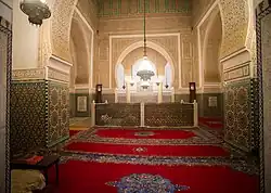 Behind the courtyard's eastern wall are the mausoleum chamber and adjoining rooms. The northernmost of these rooms, which can be accessed directly from the northeastern corner of the courtyard, consists of an indoor patio or courtyard covered by a high cupola ceiling.[4][12] The layout of this patio is similar to the Chamber of the Twelve Columns in the Saadian Tombs, consisting of a square delineated by twelve marble columns arranged in groups of three at each corner, around which runs a gallery space.[4] Another mihrab is set into the eastern wall, while a small side-chamber is set into the western wall. The pavement and lower walls are decorated with zellij tilework that feature circular or radiating geometric patterns, typical of Moroccan architecture. The upper walls and the areas around the mihrab and doorways are decorated with carved and painted stucco featuring arabesque and epigraphic motifs also typical of Moroccan architecture. At the center of the patio is an ornate fountain, and while the cupola ceiling above primarily features painted and carved wood. The cupola is high enough to allow for windows that bring in natural light. The marble columns feature Moroccan-Andalusian capitals carved with leaf, palm, and palmette motifs.[12][4] These marble columns, as well as the ornately-carved marble panels in the archway leading to the mausoleum antechamber, are believed to be spolia taken by Moulay Isma'il from the former Saadian palaces of in the Kasbah of Marrakesh (such as the Badi Palace).[15]: 270