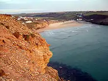 The sandy beach, backed by dunes with cliffs at each end, is quality-assessed and supervised by lifeguards during the summer. It is a popular surfing location. The South West Coast Path passes behind the beach and the area attracts holiday-makers.[3]