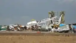 Shortly after an EF3 tornado in Caddo County dissipated, this tornado began in southwestern Candian County and quickly became violent, debarking numerous trees as it passed through areas several miles southwest of Calumet. As it approached and crossed I-40 west of El Reno, it reached its maximum intensity. Three people were killed as two vehicles were tossed more than 1,093 yards (999 m) from the road and obliterated, the victims being found stripped of clothing 1⁄4 mile (0.40 km) from the interstate and left "unrecognizable". Only pieces of the vehicle's frames were reportedly recovered.[24][25][26] A nearby 20,000-pound (9,100 kg) oil tanker truck that was parked at an oil production site near the interstate was thrown approximately one mile (1.6 km) into a wooded gully.[23][27] Several homes were swept completely away along I-40, trees were completely debarked, and the ground was heavily scoured in some areas.[28][29] At the nearby Cactus-117 oil rig site, a 1,900,000-pound (860,000 kg) oil derrick was blown over and rolled three times. Due to the extreme nature of the damage at the Cactus-117 oil rig and along I-40, damage in that area was rated EF5. The tornado weakened slightly as it passed north of El Reno and continued northeast, producing EF3 to EF4 damage in rural areas.[22][25] The tornado then reintensified and passed northwest of Piedmont as a high-end EF4, leveling multiple homes and causing additional fatalities. The Falcon Lake subdivision was particularly hard hit, and multiple homes and vehicles were swept into the lake. One home had nothing left but the foundation slab and an above ground reinforced concrete shelter sustained damage to its metal door from debris impacts. An SUV in this area was thrown 780 yards (710 m) into a wooded thicket, and had its frame torn from the vehicle body, which was found crumpled around a debarked tree. The frame was twisted apart and was found nearby, along with the engine block and axles.[23][30] The tornado weakened to EF3 strength as it crossed into Kingfisher County debarking trees and heavily damaging structures. The tornado then weakened further to EF2 strength, with damage confined to outbuildings and trees.[22] Crossing into Logan County south of Cashion, the tornado reintensified slightly, producing a mixture of EF2 and EF3 damage as large high-tension towers were toppled and manufactured homes were destroyed. Frame homes were left with only interior rooms standing in this area, and two people who were caught outside during the tornado were killed. The tornado then rapidly weakened, causing EF0 to EF1 damage along the north side of Guthrie before dissipating.[25][31]