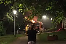 There was a smaller disturbance in southern Stockholm, but it is not known whether it was related to Husby. The trouble also spread to Fittja, Kista, Rinkeby, and Tensta.[7] On the night of Tuesday 21 May, the disturbances spread to Bredäng, Edsberg, Flemingsberg, Norsborg and Skarpnäck. Thirty cars were set on fire, and the Jakobsberg police station and shopping center were vandalized. Eight people were arrested. Calm had returned by 3 am.[16] The disturbances continued on 22 May when a large number of cars were set on fire. In Rinkeby 7 cars were burned.[17] In Rågsved, a police station was burned down. In Hagsätra, the police were attacked at 10 pm, and one police officer was injured. In Skogås, a restaurant was burned down and firefighters were attacked with stones.[18] On Thursday, 23 May, at about 8 pm (CET) police were called to Rinkeby to a spot where five cars had been set on fire.[19] Youths also threw rocks and glass bottles at a Metro station in Vällingby, breaking windows on several Metro trains and threatening staff at the station before leaving the scene.[19][20] After midnight, several small fires were reported in Tensta and Farsta.[19] At least two schools, a police station and 15 cars were set ablaze. Thirteen people were arrested that night and the following morning.[21]