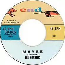 "Maybe" is a song with words and music originally credited to End Records owner George Goldner and "Casey". The co-writing credit was later transferred to Richard Barrett. Arlene Smith, lead singer of the Chantels, is believed to be an uncredited co-writer.[1] The song was first recorded by the Chantels on October 16, 1957, in a doo-wop style with Barrett playing piano, and released in December 1957. It climbed the charts in January 1958, reaching No. 15 in the Billboard Hot 100 and No. 2 in the Billboard R&B chart. It was subsequently described as "arguably, the first true glimmering of the girl group sound".[2] Rolling Stone ranked it No. 199 on its list of The 500 Greatest Songs of All Time.[1] It was also included in Robert Christgau's "Basic Record Library" of 1950s and 1960s recordings, published in Christgau's Record Guide: Rock Albums of the Seventies (1981).[3]