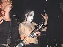 After two brief replacements, Maniac and Manheim's positions were filled by Swedish vocalist Pelle Yngve Ohlin ("Dead") and local drummer Jan Axel Blomberg ("Hellhammer"). With Dead, the band's concerts became notorious. For concerts, Dead went to great lengths to achieve the image and atmosphere he wished. From the beginning of his career, he was known to wear "corpse paint", which involved covering his face with black and white makeup. According to Necrobutcher, "it wasn't anything to do with the way Kiss and Alice Cooper used makeup. Dead actually wanted to look like a corpse. He didn't do it to look cool".[11] Hellhammer claimed that Dead "was the first black-metal musician to use corpse paint".[12] To complete his corpse-like image, Dead would bury his stage clothes and dig them up again to wear on the night of a concert.[13][14]