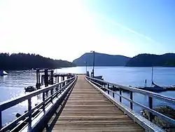 During the late 19th century, Mayne Island was the commercial and social centre of the Gulf Islands. The port at Miners Bay was always busy due to the steady stream of marine traffic travelling through Active Pass, the narrow, curving strait separating Mayne from Galiano Island to the north, which is the main ferry route between the Mainland and Vancouver Island today. The historic village at Miners Bay remains the commercial centre of the island, with the annual Fall Fair still being held at the old Agricultural Hall like so many years before. Miners Bay is also the site of the Springwater Lodge which was built in 1892 and remains the oldest continuously operated hotel in British Columbia.[2] Nearby Active Pass still throbs with a steady stream of marine traffic, a bustling contrast to the island's quiet interior byways. Village Bay, with its BC Ferries terminal, has several late 19th-century to 1930s buildings. Active Pass is named after the American survey ship USCS Active, the first steam vessel to navigate the pass.[3]