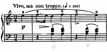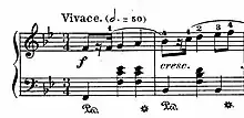 The final mazurka is the shortest of the set, taking less than a minute to perform. It is a rare example of humour in Chopin's music. Written in the joyful key of C major and marked Vivo (meaning lively), it features a constantly repeating theme which has a jokeful character. The piece ends abruptly with the same motif of the opening bars, repetitive octaves of Gs. The ending is unusually marked Senza fine - literally without end.[5]