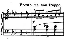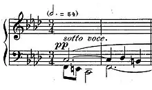 The third mazurka, in F minor, has a folkish and rustic atmosphere. After a few bars of introduction, the main theme appears, characterized by a colorful Slavic melody and sharp rhythms and accents. The second theme, A-flat major, is quite lively and includes a section with a bass motif. The main theme is reprised, this time in a slightly modfied form, and the piece ends quitely, marked pianissimo. A performance of the mazurka lasts for a little under three minutes.[3]