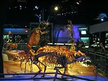 The entrance to the hall showcases six fossil shark jaws, ranging in height from 2–9 feet. The exhibition begins with five extinction events described in dioramas that lead visitors onto the Florida Platform at about 66 million years ago, also known as the Dawn of the Age of Mammals. Displays include a primitive-toothed whale in the Eocene, a pig-like, extinct mammal from the Oligocene, a Miocene rhinoceros being attacked by two saber-toothed, cat-like animals, a 15-foot (4.6 m)-tall sloth standing on its hind legs in the Pliocene area and a 500,000-year-old jaguar chasing a peccary from the Pleistocene epoch. The time periods also include artwork by paleoartists from around the world, including a 9-foot (2.7 m)-tall steel sculpture of an extinct Terror Bird, Titanis walleri.[8]