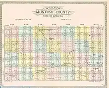 The Dakota Territory legislature created the county on March 9, 1883, with areas partitioned from Campbelll, Logan, and McPherson counties, and with some previously unorganized areas. It was named for Edward H. McIntosh, a territorial legislator at the time.[3] The county seat was originally Hoskins, but changed in 1888 after everything in Hoskins but the school was moved three miles east to the new Soo Line Railroad townsite of Ashley.[4] The county government was not organized at that date, but the new county was not attached to another county for judicial or administrative purposes. Its government was organized on October 4, 1884.[5]