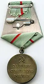 The Medal "To a Partisan of the Patriotic War"[2] (Russian: Медаль «Партизану Отечественной войны», Medal "Partizanu Otechestvennoi voiny") was a World War II Soviet paramilitary award established in two classes on February 2, 1943, by decree of the Presidium of the Supreme Soviet of the USSR.[1] to recognise the fortitude and courage of the partisans on the home front in their struggle to free the Soviet Motherland of the Nazi invaders far behind enemy lines. Its statute was amended by a further decree of the Presidium of the Supreme Soviet of the USSR on February 26, 1947.[3]