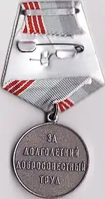 The Medal "Veteran of Labour" was awarded to workers for many years of hard work in the national economy, sciences, culture, education, healthcare, government agencies and public organizations.[1] The medal was awarded to workers, farmers and employees in recognition of their lifelong labour on reaching the seniority required for a long-service pension or retirement age.[4] Decree of the Presidium of the Supreme Soviet of the USSR number 5822-IX of June 8, 1977[3] added the rank and file and the officers of the Ministry of Internal Affairs as potential recipients under the same award criteria as the labourers mentioned in the August 12, 1983 decree.[4]