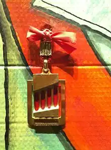 Recipients of the honour receive a medal in recognition; unlike for example the Catalonia International Prize, which comes with financial award but no designated honour. The medal resembles the Four Bars (which may be recognised as the Senyera with top-to-bottom stripes) and was based on a design created by Antoni Cumella i Serret in 1984.[lower-alpha 1][2] In 2000, goldsmith Joaquim Capdevila i Gaya adapted the design so it could be produced as medals.[2]