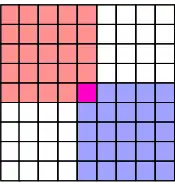 The second observation is that we can use the sorted matrix structure to instantly compare any element to at least half of the entries in the matrix. For example, the median of the row medians across the entire matrix is less than the upper left quadrant in red, but greater than the lower right quadrant in blue: