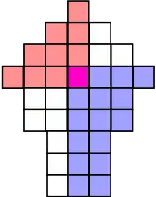 More generally, using the boundaries given by the and vectors from the previous section, we can assume that after some iterations, we have pinpointed the position of the medcouple to lie between the red left boundary and the blue right boundary:[4]: 149