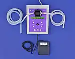 A media dispenser or a culture media dispenser is a device for repeatedly delivering small fixed volumes (typically between 1 ml and 50 ml) of liquid such as a laboratory growth medium like molten agar or caustic or volatile solvents like toluene into a series of receptacles (Petri dishes, test tubes, Fernbach flasks, etc.). It is often important that such dispensers operate without biological or chemical contamination, and so must be internally sealed from the environment and designed for easy cleaning and sterilization before use. At a minimum, a media dispenser consists of some kind of pump connected to a length of discharge tubing or a spout. Dispensers used in laboratories are also frequently connected to microcontrollers to regulate the speed and volume of the medium as it leaves the pump.