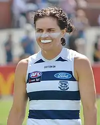 Meghan McDonald (born 29 June 1991) is an Australian rules footballer with the Geelong Football Club in the AFL Women's competition (AFLW). She previously played with the Western Bulldogs in the 2017 season. McDonald was recruited by the Western Bulldogs as a free agent in November 2016.[1] She made her debut in the seven point loss to Collingwood at VU Whitten Oval in round four of the 2017 season.[2] She played four matches in her debut season and kicked one goal.[3] She was delisted at the conclusion of the 2017 season.[4] In September 2018 she accepted a contract with Geelong to play in the club's inaugural season in the AFLW in 2019.[5] She was awarded Geelong's best and fairest medal in her debut season at the club.[6] In December 2020, McDonald was announced as Geelong's captain, replacing Melissa Hickey who retired at the end of the 2020 season.[7] In the 2021 AFL Women's season, McDonald was awarded with her second All-Australian blazer, named on the full back position.[8][9] McDonald achieved selection in Champion Data's 2021 AFLW All-Star stats team, after leading the league for average intercept possessions in the 2021 AFL Women's season, totalling 8.3 a game.[10]
