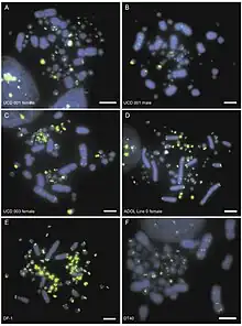 Cytogenetic studies employ fluorescence in situ hybridization (FISH) with telomeric probes[1][8] to label telomeres on chemically-treated cells fixed to glass slides. More specifically, telomere-peptide nucleic acid fluorescein probes are frequently used to identify telomeric sequence repeats on mitotic metaphase and interphase or meiotic pachytene-stage chromosomes. FISH images allow both the identification of mega-telomeric chromosomes and the visualization of chromosome structure, GC-rich DNA regions, and, depending on the experiment, co-localization with genetic regions or genes.