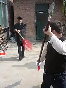 Training in Meihuaquan includes the use of eighteen types of traditional weapons, some of which are rarely seen. This is the list of weapons in Baijiazhi Meihuaquan in Taiwan: dandao (單刀),[18] Qimeigun (齊眉棍),[19]qiang (槍, spear),[20] shuangdao (雙刀, double sabre), Xiao shao gun (小哨棍),[21] jian (劍), Da shao gun (大哨棍), jiujie gangbian (九節鋼鞭, see jiujiebian), liuxingchui (流星錘, meteor hammer), sanjiegun (三節棍),[22] Meihua Guai (梅花拐), Bishou (匕手),[23] dadao (大刀, alebard). The first book on rarely-seen weapons is by Genyuan (根源):