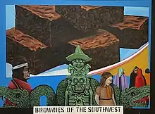 The 153 paintings that make up the "Humanscape" series were inspired by a "glimpse of a drive-in movie screen."[6] Cordova, who curated four Humanscape exhibitions with approximately half of the paintings,[20] divides the Humanscapes into five groups.[6] In the first group, from 1965 through 1967, Casas made depictions of audiences watching films at drive-in cinemas and conventional movie theaters. The blurry, nebulous audience members were gradually endowed with more color and form, and from late 1967 through 1970, many Humanscape paintings dealt with the Sexual Revolution. Casas began making politically themed paintings in 1968, and he emphasized this subject matter from 1970 through 1975. From 1975 through 1981, Casas' favorite topic was art about art. Finally, from 1982 through 1989, the last Humanscapes treated what Casas called the "Southwestern clichés."