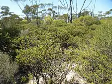 Melaleuca adnata occurs in and between the Kalbarri, Ongerup and Mount Holland districts[2] in the Avon Wheatbelt, Coolgardie, Esperance Plains, Geraldton Sandplains and Mallee biogeographic regions.[6] It grows in sandy or clayey soils, sometimes over laterite, along drainage lines and flats.[7]