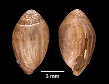 Melampus bidentatus common name the "common marsh snail", "eastern melampus", or "coffee bean snail"[1] is a species of small, amphibious air-breathing snail, a pulmonate gastropod mollusk in the family Ellobiidae.