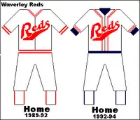 Waverley white with red trim top with "Reds" across the front, Red undershirt, white pants with red double strip down the leg, white socks with red t-bars.