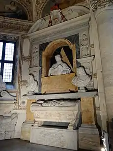 The tomb of Cardinal Giovanni Garzia Mellini (died 1629), the vicar general of Rome was created by Alessandro Algardi in 1637-38.[6] The monument was erected by the cardinal's nephews, Mario and Urbano Mellini but only after a conspicuously long time their uncle's death. The centrepiece of the monument is the white Carrara marble bust of the Cardinal in a niche which shows him leaning forward and turning towards the altar, his left hand on his heart and his right hand holding a prayer book. The work was much admired in Algardi's day because it conveys a sense of Baroque piety combined with expressive realism and brilliantly observed, technically perfect details. The monument itself is a classicising aedicule framed by flat pilasters with masks and crowned by a broken segmental pediment with the Mellini coat-of-arms in a conch. The big letter M, the main symbol of the family, recurs on the trapezoid sarcophagus (and the other Baroque tombs in the chapel). The Doric frieze is decorated with ecclesiastical objects (crozier, chalice, holy vessels and mitre). The voluminous epitaph follows the stages of Giovanni Garzia's prestigious career from his youth until his death, including his important diplomatic missions for Pope Paul V to Philip III of Spain and the warring Habsburg brothers of Emperor Rudolf II and Matthias.