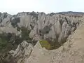 The area around Melnik is strikingly eroded, particularly the enormous area of cliff that serves as a backdrop to the town. This area, covering some 17 km² near Melnik, Kurlanovo and Rozhen, has been called the Melnik Earth Pyramids or Melnik Badlands. The hills in this area can rise up to 100 metres (330 ft) high.[7] The unique formations, which can resemble giant mushrooms, ancient towers, and obelisks, were formed when heavy rain eroded the sand and clay the hills are composed of.[7]