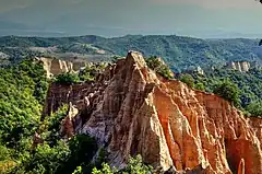 The Melnik Earth Pyramids (Bulgarian: Мелнишки пирамиди) are rock formations, known as hoodoos, situated at the foothills of the Pirin mountain range in south-western Bulgaria. They span an area of 17 km2 near the town of Melnik, Blagoevgrad Province. Reaching a height of up to 100 m these sandstone pyramids are shaped in forms, resembling giant mushrooms, ancient towers and obelisks. They were formed primarily due to erosion from rainfall and bedrock wear. The Melnik Earth Pyramids are a geological phenomenon of global importance and were declared a natural landmark in 1960.[1] The rock formations are home to rich flora and fauna heavily influenced by the Mediterranean climate. They are a tourist destination due to the natural environment of the area, the cultural sights of Melnik and the Rozhen Monastery.