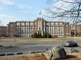 In 1932, another new school was built and the previous school building became the Calvin Coolidge Elementary School. This time the new building was built on swamp land taken from Ell Pond on Lynn Fells Parkway. It was a very large school, featuring a 900-seat Auditorium and a full size gymnasium. 1961 saw the addition of the Daffinee Gymnasium which contained new locker rooms for both basketball and football and also extra classroom space. The addition also included the construction of a three-floor annex attached by a bridge.[6] Many historians praised the main building for its period design and architectural beauty.
