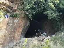 The Melville Koppies Cave. The plaque indicates that it is a Johannesburg Heritage site. The plaque states: "The cave is a fissure formed between 2.9 billion-year-old quartzite rocks of what is now the Melville Koppies Ridge. For hundreds of years the cave provided a shelter for people living around and moving across the area. The site was excavated in 1971. An analysis of the archaeological remains found in the cave suggests that, as early as 1500 A.D., farming communities made use of the resources the area had to offer. When supplies dwindled they supplemented their diet with wild plants and hunted wild animals."