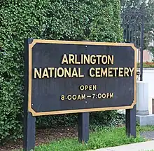 On July 16, 1862, the United States Congress passed legislation authorizing the purchase of land for national cemeteries for military dead.[7] In May 1864, large numbers of Union forces died in the Battle of the Wilderness, requiring a large new cemetery to be built near the District of Columbia.[8] A study quickly determined that the Arlington Estate was the most suitable property for this purpose.[8] Although the first military burial at Arlington occurred on May 13, 1864,[2] formal authorization for burials did not occur until June 15, 1864.[5][9]