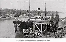 The Merisaar was a 2,348-ton merchant steamer built in Austria-Hungary in 1900. She was 290 ft. long with a breadth of 42 ft. and 18 ft. of draught. Originally named Anna Goich, she was sold to Estonian interests after WWI and after Merilaid acquired the ship in 1930 she was renamed Merisaar. Merisaar's home port of Tallinn is clearly seen in aft views of the ship.[9]
