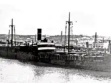 On June 23, 1940, Merisaar left New Orleans for Cork, Ireland with a cargo of timber. In the North Atlantic Ocean, late in the evening of July 12, 1940, German submarine U-99 attacked Merisaar with one torpedo, which missed. About an hour later another torpedo was fired but this also missed, as the seas were very rough. The U-boat then forced the ship to stop by using its 20mm gun, and the German commander ordered the ship to proceed to Bordeaux, France, that was under German control.[10] A few days later, on the evening of July 14, Merisaar was strafed by a Luftwaffe Heinkel 111 bomber. The 26 crewmembers lowered the life rafts and abandoned ship, rowing away as fast as they could. On its next run the aircraft dropped a bomb on the engine room and the ship caught fire and sank off Queenstown, Ireland.[11][12] The entire crew survived and was left with about 120 miles to row to shore. A French fishing trawler found them two days later and took them to Lorient, France. After three months' internment in a German camp the ship's captain, August Schmidt (1883–1974), and crew were released.[13]